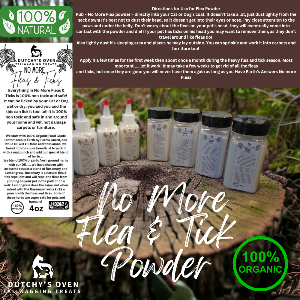 Rub ~ No More Flea powder ~ directly into your Cat or Dog's coat. It doesn't take a lot, just dust lightly from the neck down! It’s best not to dust their head, so it doesn't get into their eyes or nose. Pay close attention to the paws and under the belly. Don’t worry about the fleas on your pet's head, they will eventually come into contact with the powder and die! If your pet has ticks on his head you may want to remove them, as they don’t travel around like fleas do!